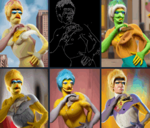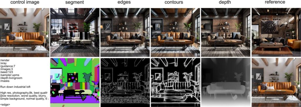 On the right, these are the transformations from the control image from the various ControlNet modes. The naming should be self-evident for most: Segment, Edges, Contours and Depth use the physical aspects as the basis for the new image. The general shape is transferred. In the case of Reference, you can see that the sofa was sampled and moved to a different part of the room. Not shown here is Skeleton (but is covered in the video above), you can upload a special kind of pose mask called a Skeleton, and take full control of the poses of your characters.