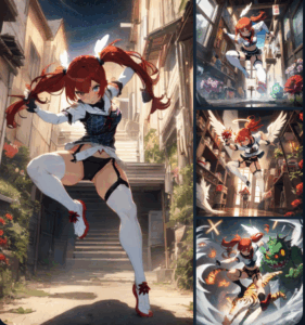 2d, kicking a tiger, redhead, bangs, pigtails, absurdres, 1girl, angel girl, garter belts, training clothes, checkered legwear, white skin, cute halo, cross-shaped mark, colored skin, (monster girl:1.3), angelic, innocent, shiny, reflective, intricate details, detailed, dark flower dojo, thorns, [lowres, horns, blurry, bad anatomy, bad hands, text, error, missing fingers, extra digit, fewer digits, cropped, (low quality, worst quality:1.4), normal quality, jpeg artifacts, signature, watermark, username, blurry, monochrome, error, simple background,] <breakanime>
